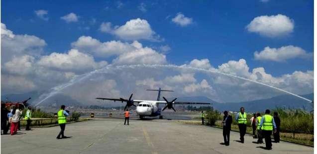 वाटर स्यालुट सहित बुद्ध एयरको एटीआर ४२ (नाइन एन–एआईएन) विमानको बिदाइ