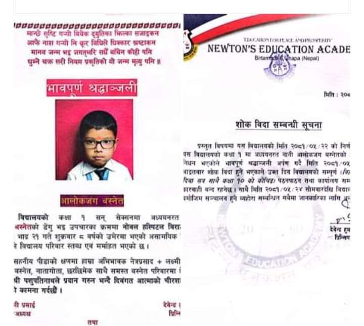 डेंगू संक्रमणबाट झापामा एक बालकको मृत्यु
