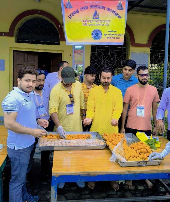 युवा व्यवसायी समाज बिर्तामोडद्वारा अर्जुनधारामा प्रसाद वितरण
